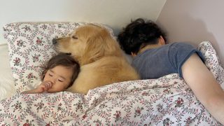 ゴールデンレトリーバー パパをベッドの端に追いやってまで一緒に寝たいと移動してくるゴールデンレトリバー